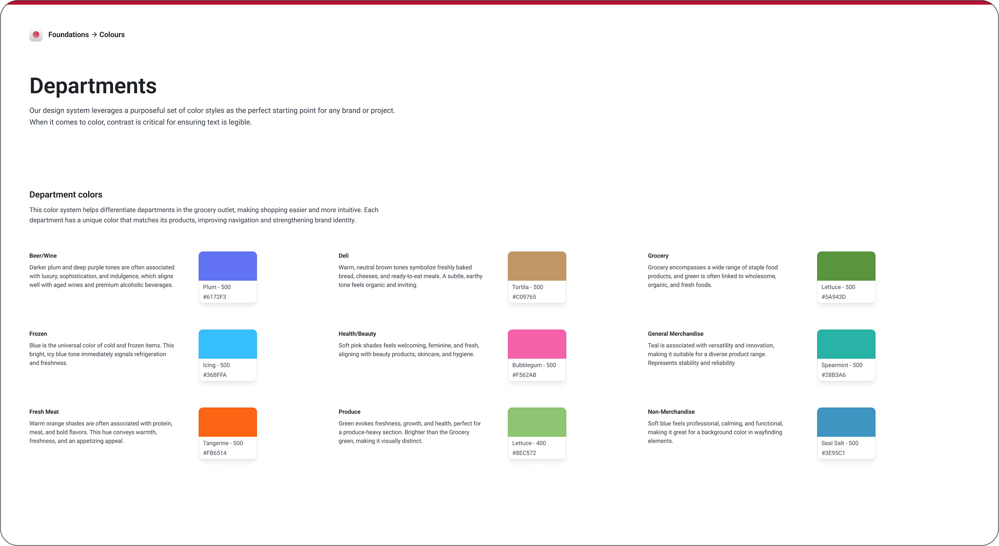 A central focus of this effort was the creation of Grocery Outlet’s first design system- a scalable, modular framework built to ensure visual consistency, accessibility compliance, and efficiency across all internal platforms. I also implemented UX Acceptance Testing (UXAT) as part of the release cycle, ensuring that every update met defined usability and accessibility standards before deployment.
