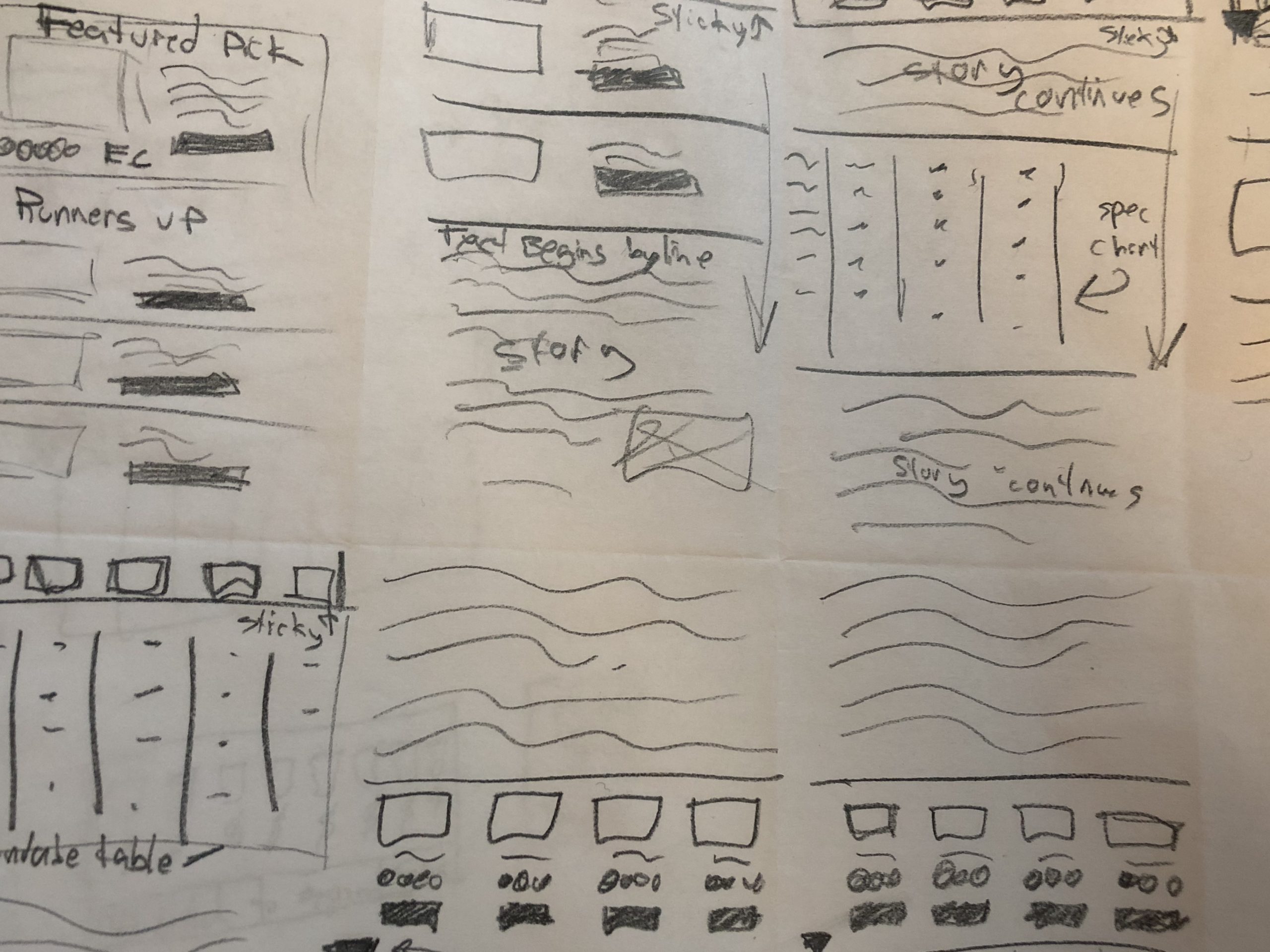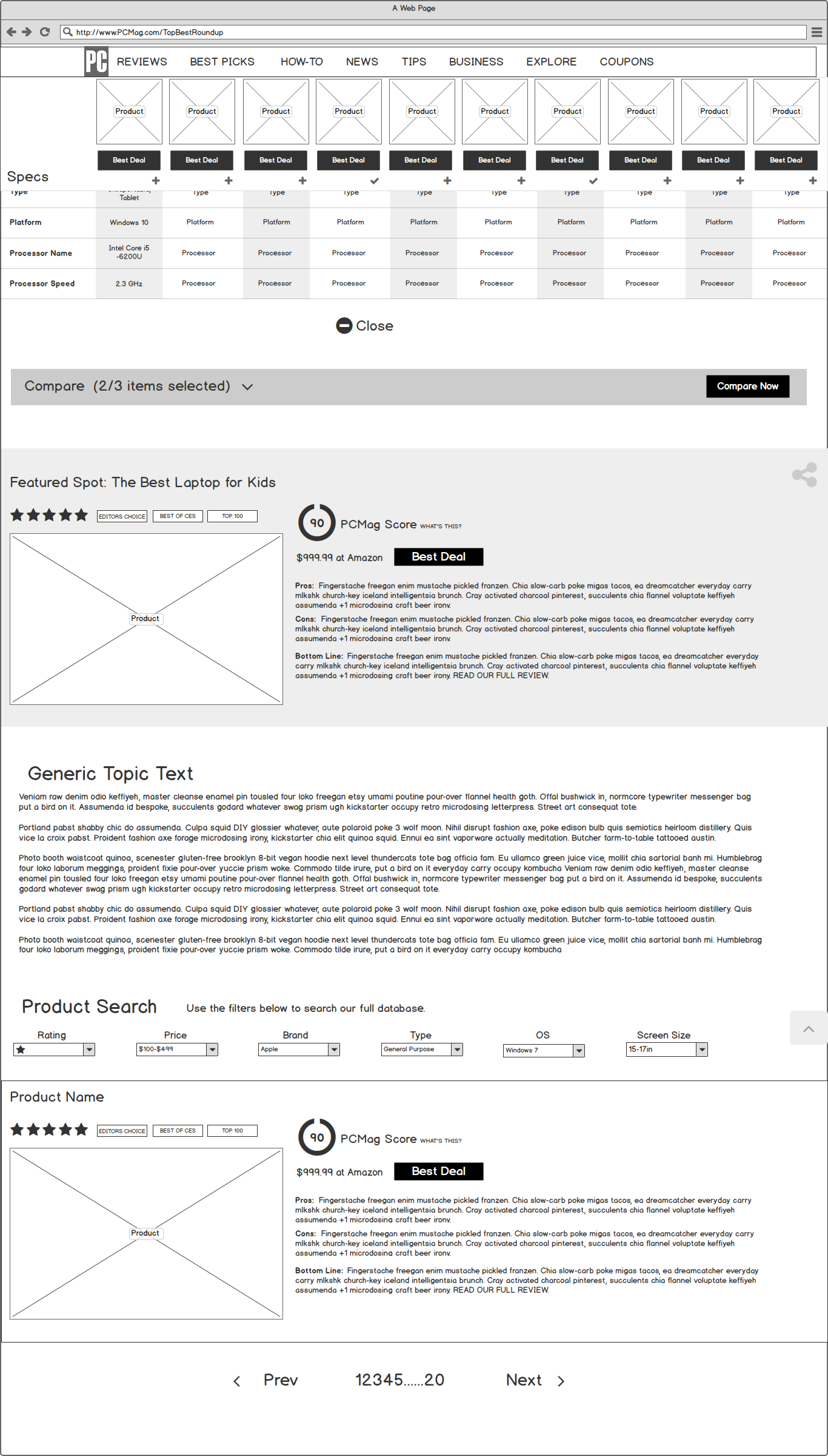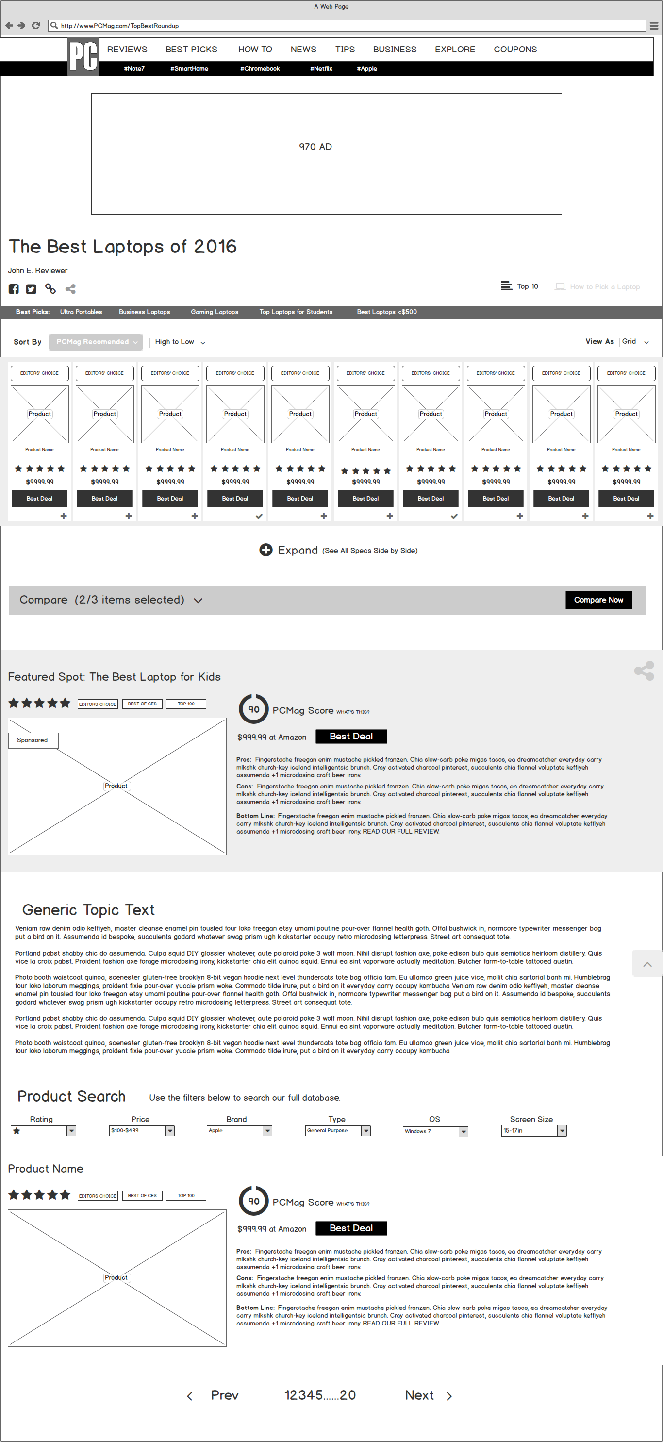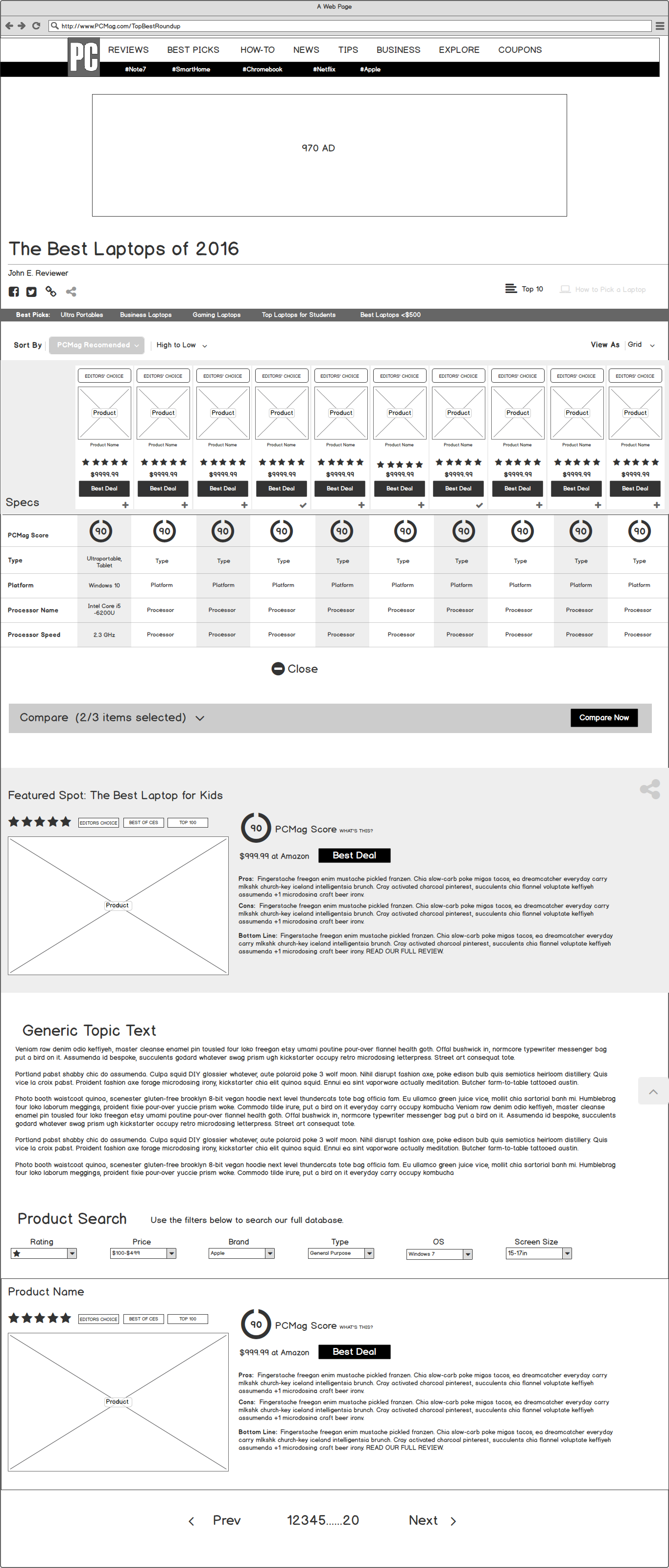 One of PCMag’s top performing pages are there Roundup page. These pages take 5-10 products and compile testing data to provide consumer comparisons. While traffic and engagement were high on Desktop, they saw a severe decline in both Tablet and Mobile engagement and conversions. The original goal was to redesign the page from Desktop down to Mobile, However, as the project progressed, it was decided that the MVP would only include Tablet and Mobile. the rationale was tied into various business goals and the need to launch in stages to test impact. The updated goal was to create a tablet and mobile specific experience that could both help increase engagement on those pages at those viewports and serve as visual direction for a possible update of the outdated (but currently steady performing) desktop pages. Below I will show all assets leading up to the final MVP. these include the original desktop wireframes that later lead to a refresh and update.