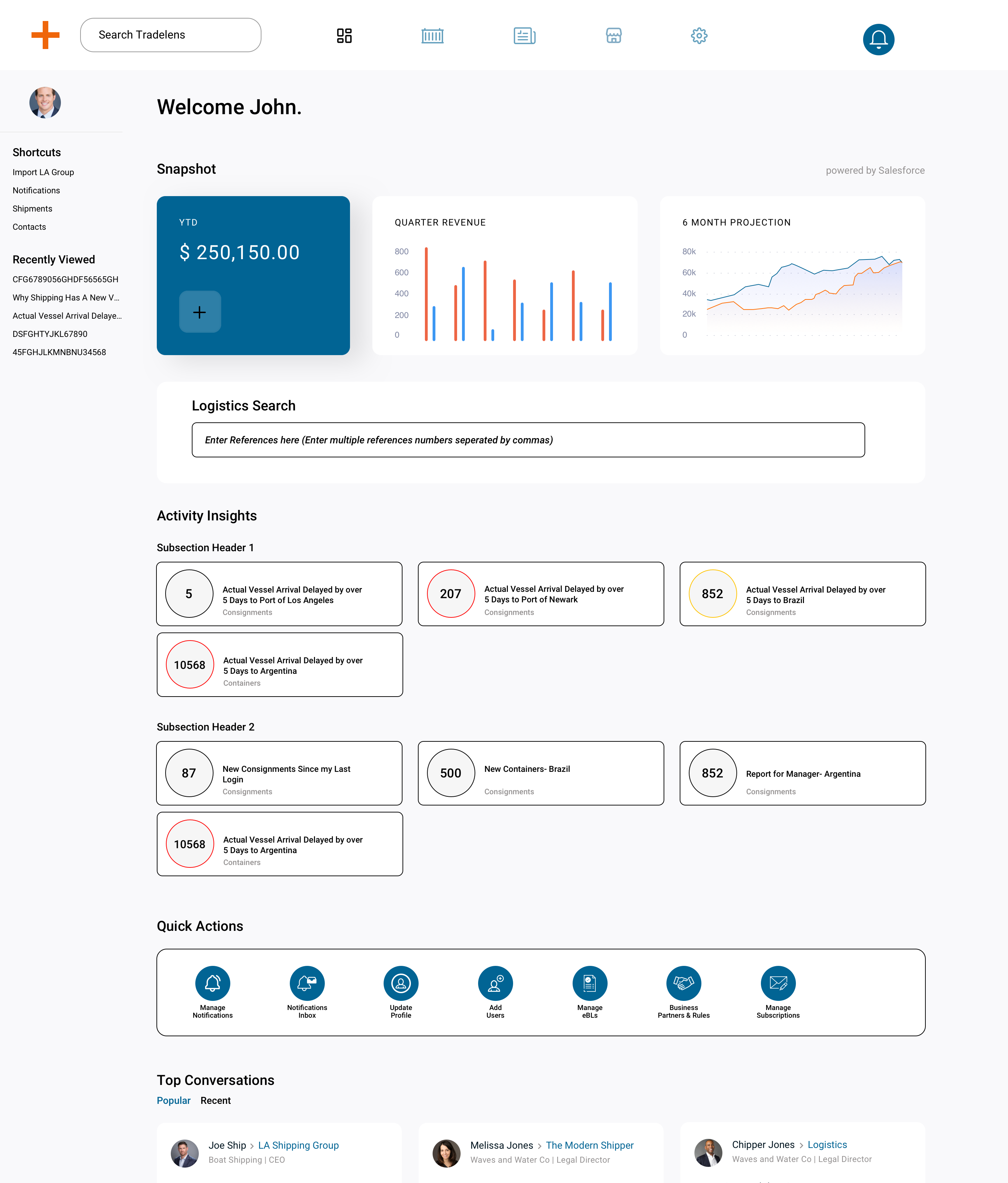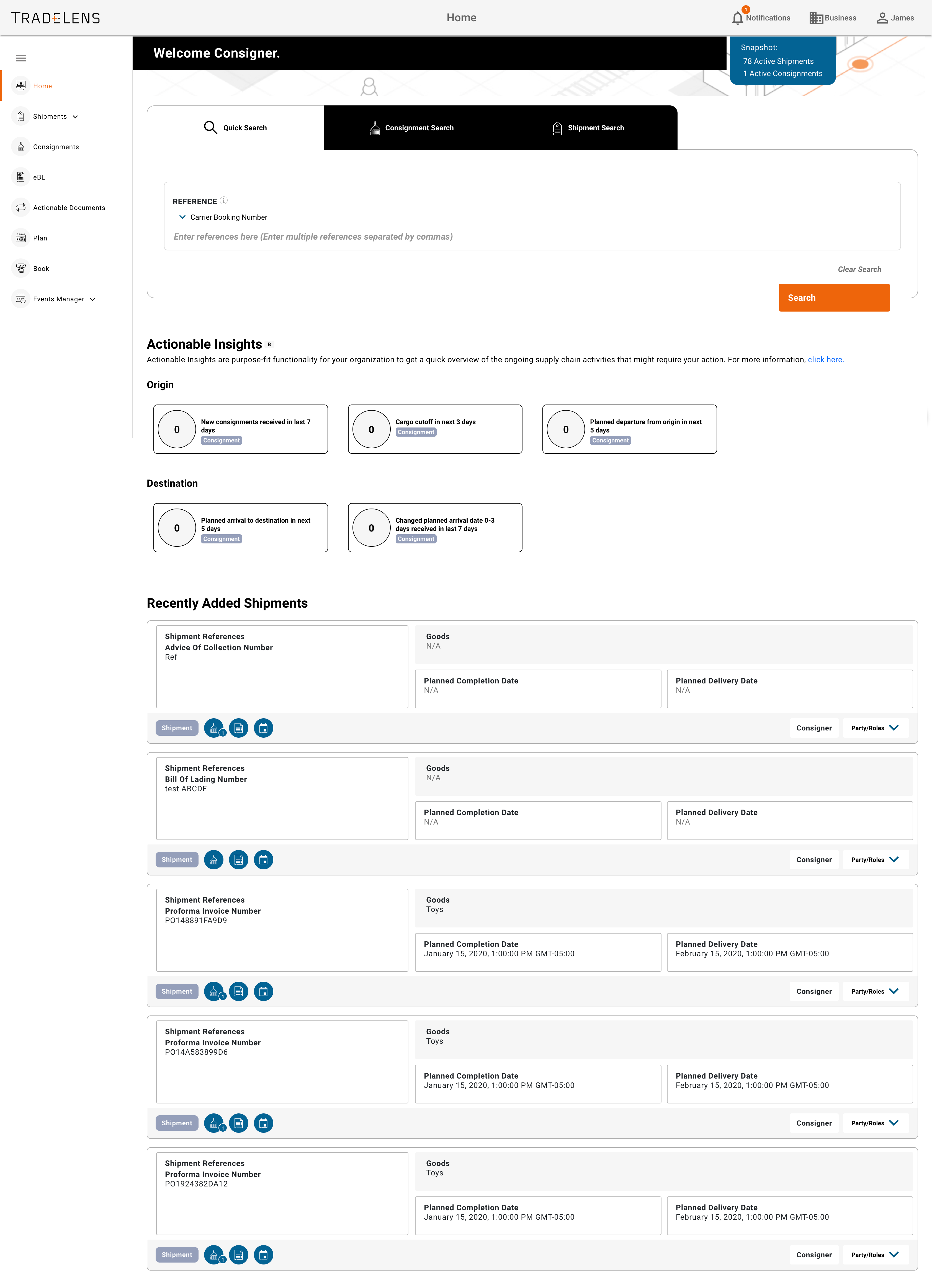 TradeLens Landing Page allows for quick navigation and answer to questions. Includes Quick/Full Search, recent items, Actionable Insights (Reporting) and split navigation.